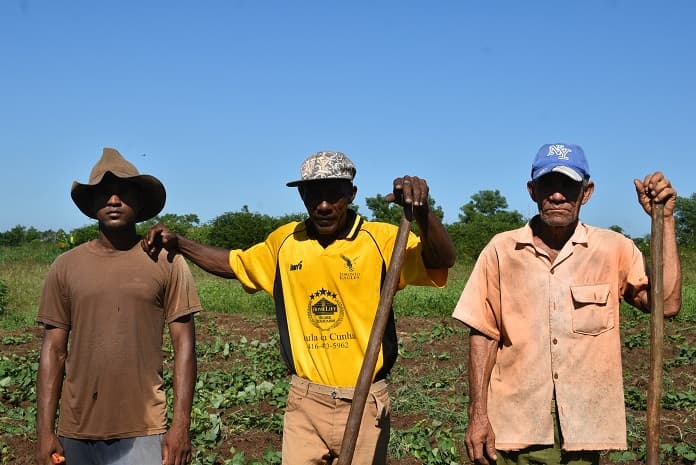«Tenemos una parte sembrada de yuca, boniato y calabaza… y un área que sí necesita de un tractor porque es imposible roturarla con bueyes. Todo esto lo hemos hecho a pecho limpio con sacrificio, trabajando duro y sin más apoyo que el que nos damos nosotros mismos» explica Abel Morales, un sesentón retranquero de ferrocarriles que en los 90 volvió a su pueblecito natal, El 60, para dedicarse a las labores en la entonces cooperativa cañera.